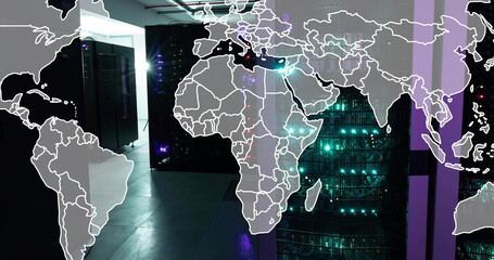 Blue charts and graphs processing data over glowing servers in dark computer server room
