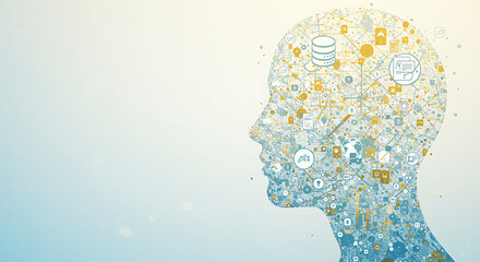 Artificial intelligence concept of a digital mind. Human head silhouette filled with a neural network of technology and data icons.