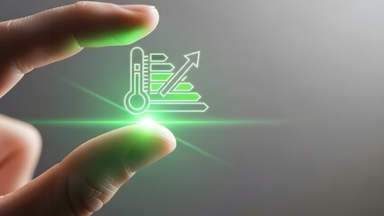 A glowing green digital projection held by human fingers illustrates vital concepts of energy efficiency, temperature control, and environmental sustainability for future innovation and progress