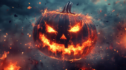 Scary Halloween jack o lantern face glowing in smoke and fire.