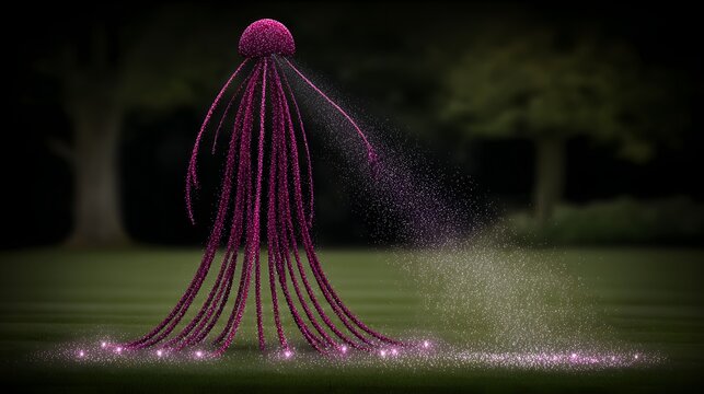 Intricate purple structure resembling a jellyfish on a grassy field.