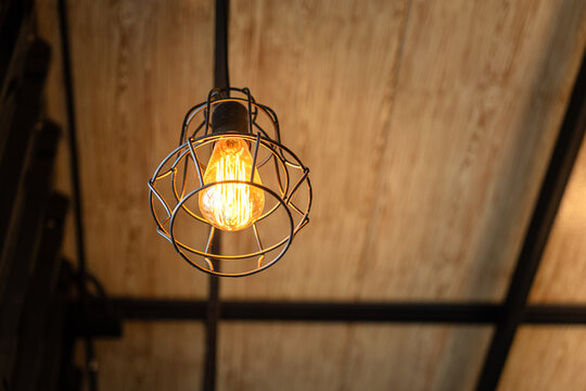 Classic designed ceiling lighting bulb with iron cage, it glowing in orange warm light shade. Object for interior decoration, close-up with selective focus.