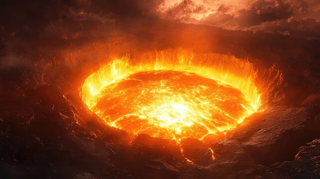 Giant sphere of molten lava glows intensely while embedded in cracked terrain, radiating heat and surrounded by smoke and clouds. Generative by AI