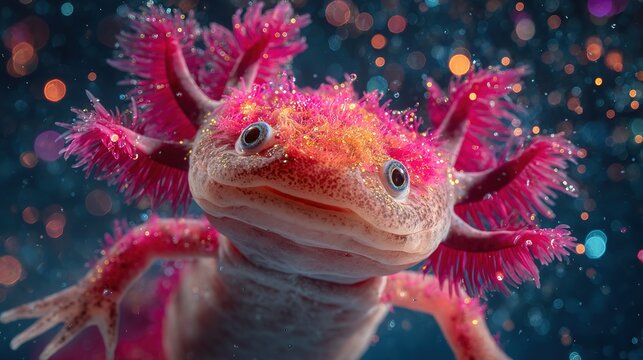 Bioluminescent axolotl with glowing limb regeneration in dark water, symbolizing nature's resilience and wonder.