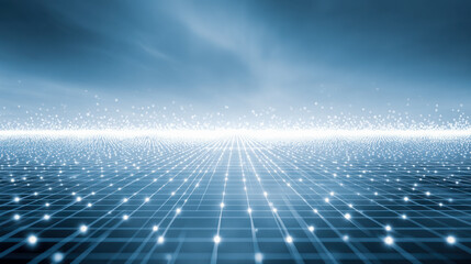 Glowing digital grid lines illuminate a dark background with intermittent bright points.