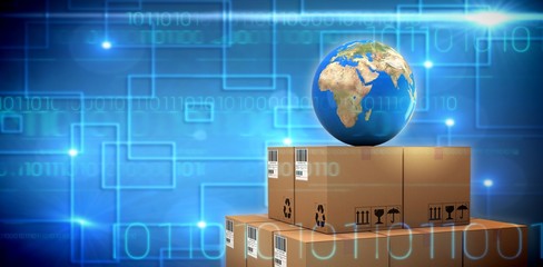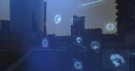 Displaying city skyline in urban plaza at dusk, featuring glowing cogwheels, waveform and globe map