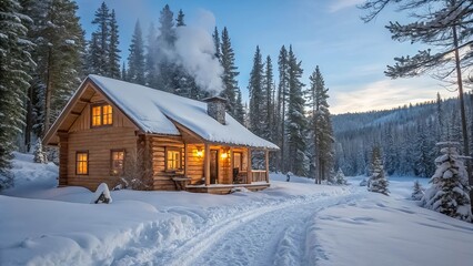 A rustic log cabin with glowing windows nestled amidst a snow-covered forest, a trail leading towards it, and wisps of smoke curling from the chimney