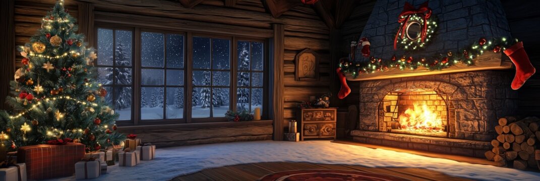 Cozy rustic cabin christmas living room with glowing fireplace and decorated tree