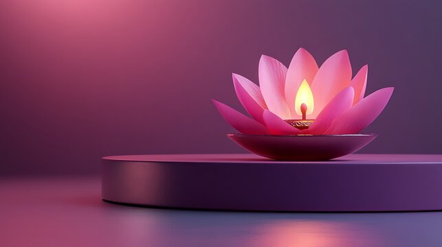Pink lotus flower with lit candle on a purple podium blossom bloom