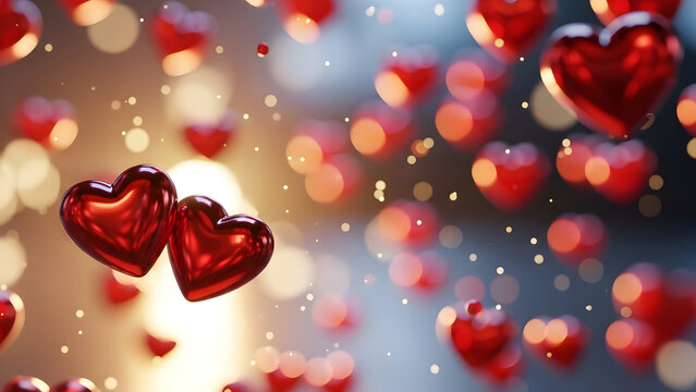 Golden Bokeh Hearts Floating on a Romantic Background with Love Symbols