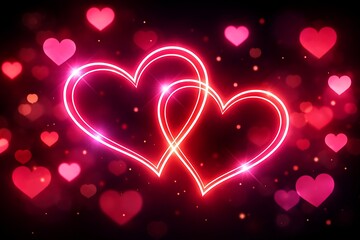 Neon hearts glowing pink, intertwined love symbols with bokeh effect