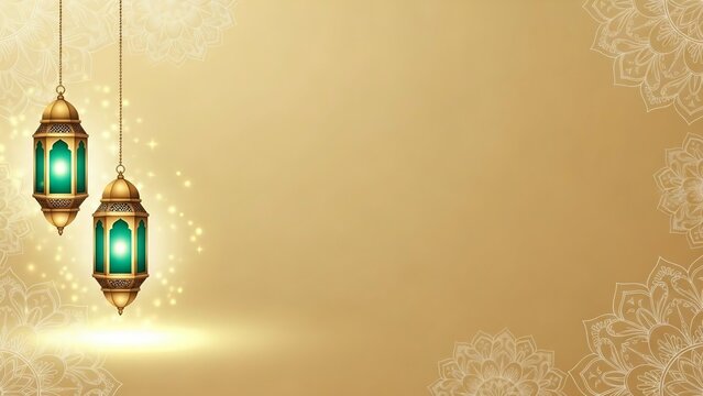 Elegant ramadan greeting background with glowing green lanterns and ornate mandala patterns