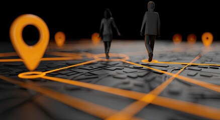 Futuristic map with glowing orange lines connecting figures and location markers