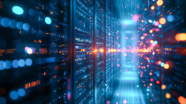 Futuristic data center with glowing servers and digital nodes