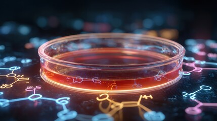 Petri dish with red culture media on laboratory table with glowing molecular structure diagrams, biotechnology and medical research concept