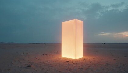 A luminous rectangular monolith stands in the desert landscape. The glowing structure emits warm light. The surreal scene evokes mystery. The art photo features a digital sky with horizon