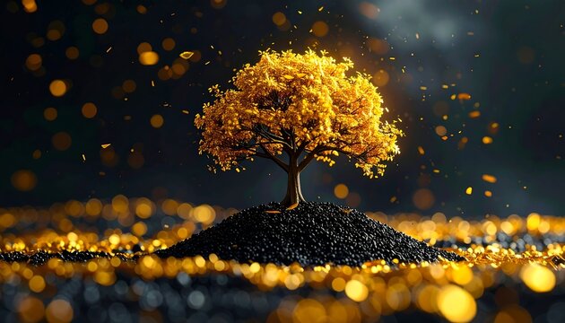 A majestic, textured mound of glittering particles, illuminated by radiating light sources, sits against a dark background