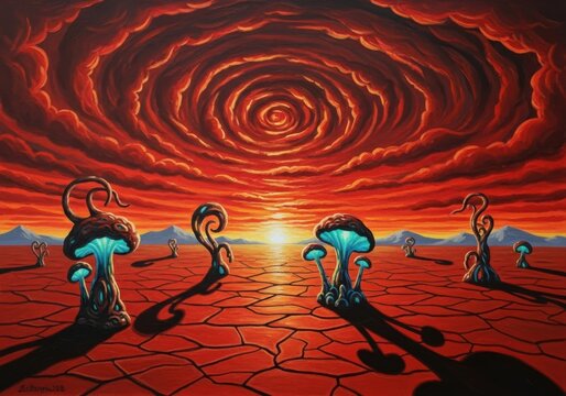 A surreal landscape with glowing mushrooms under a swirling sunset sky, creating a fantasy art painting