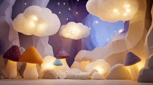 Fantasy dreamscape baby room with magical mushroom lights and floating clouds creating a whimsical world of comfort and imagination for newborns