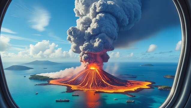 A cinematic airplane window view shows a massive volcanic eruption below with glowing lava, thick smoke, and a mushroom ash cloud. Calm ocean and ships surround the island under a clear blue sky.