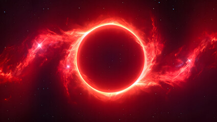 A captivating view of a powerful red celestial body in deep space with glowing nebula