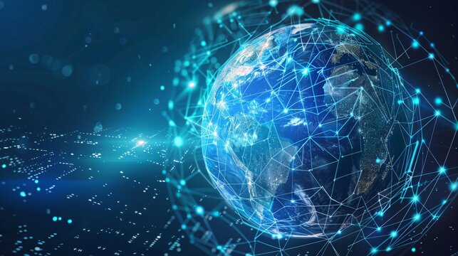 Futuristic globe with abstract connected lines and blue neon color on dark background