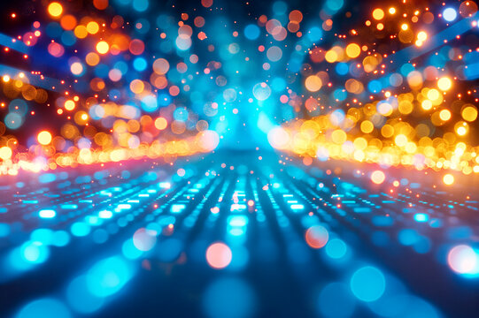 Holographic futuristic graphic with glowing shapes and particle effects over a dark gradient.