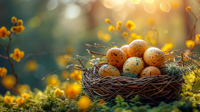 Easter scene in serene style with lit green candle in wicker nest on blue surface against soft bokeh background with copy space.