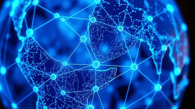 Glowing blue digital globe shows network connections, highlighting global communication and technology.