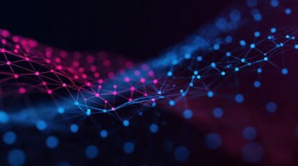 Abstract digital network with glowing nodes and lines on dark background. Ideal for themes of AI, big data, cybersecurity, communication, and futuristic technology.