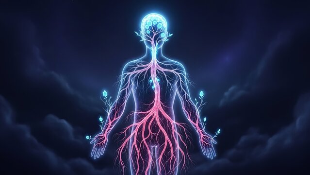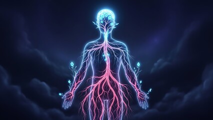 Futuristic rendering of human torso with glowing neural pathways