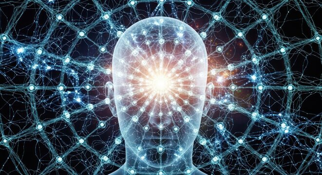 A human head with a glowing brain and a network of interconnected neural pathways.
