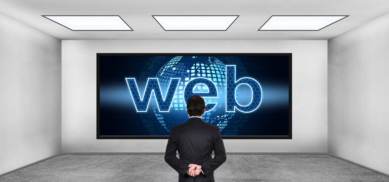 Businessman looking on futuristic web hologram with digital earth