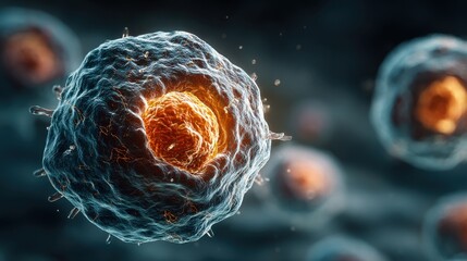 Highly detailed macro shot of glowing biological cell with fiery nucleus and dynamic textures surrounded by blurry cellular structures perfect for medical visuals, biotech designs and science backgrou