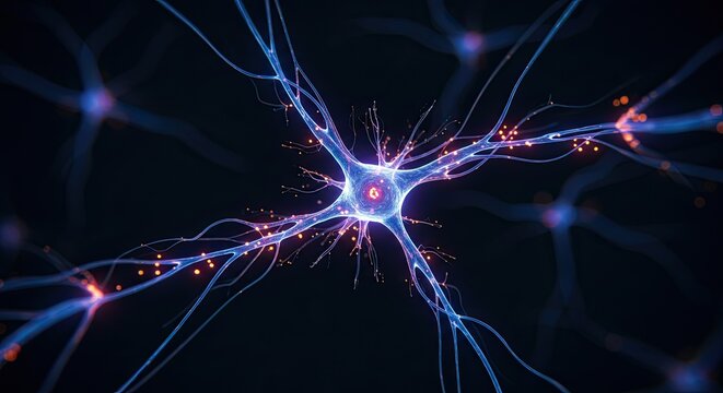 Close-up view of a glowing blue neuron with electrical impulses, representing the human nervous system and brain activity.