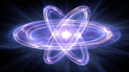 Abstract depiction of an atom with swirling energy orbits and a glowing nucleus
