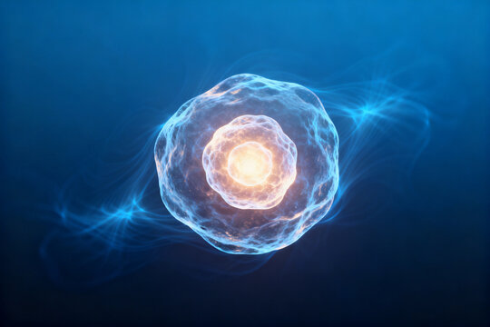 Detailed 3d model of a human animal cell with glowing nucleus and organelles