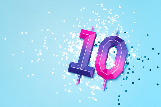 10 years celebration festive background made with colorful candle in the form of number Ten lying on sparkles. Universal holiday banner with copy space.