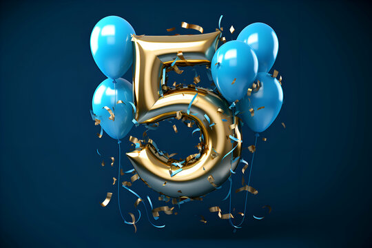 Number 5 gold balloons and confetti. Birthday greeting card. 3D Render