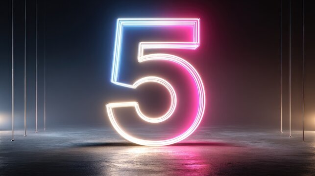 Shiny pink balloon, shaped as number five, with colorful party decorations, and glowing festive background.