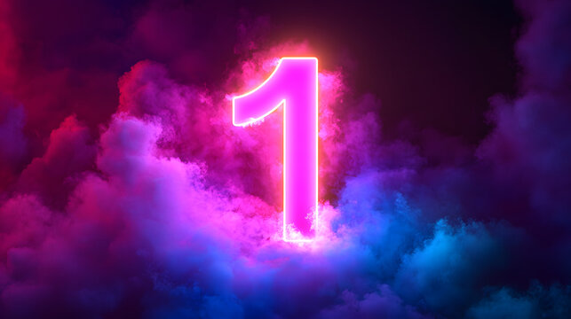 3d render, number one glowing in the dark, pink blue neon light