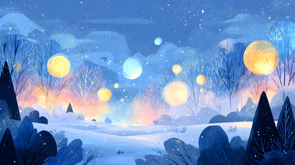 Surreal dreamscape with orb-topped trees reflecting in serenity