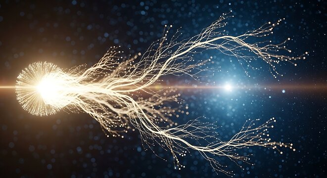 Neon circuit stream connecting futuristic data network with glowing nodes and particles