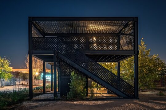 Modern black metal structure illuminating the night sky