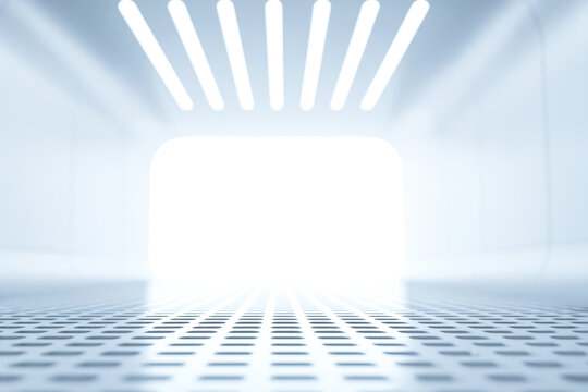 Glowing neon wave panel casting colorful reflections on glossy floor minimalist futuristic light art