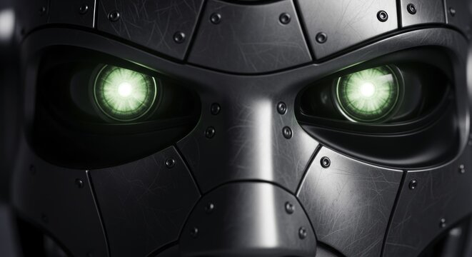 Close-up of a Metallic Robot or Armored Mask with Piercing Green Glowing Eyes and Scratched Textures