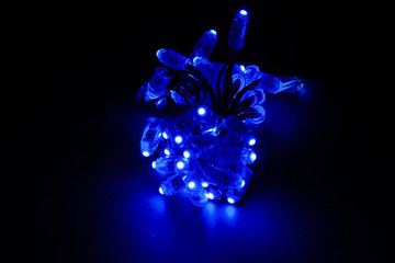 Glowing blue led pixels christmas holiday lights on black background.