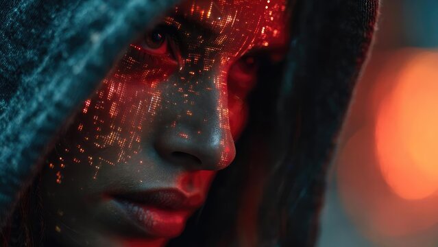 A futuristic digital skull with glowing red eyes, composed of glitching green and blue pixels and binary code.