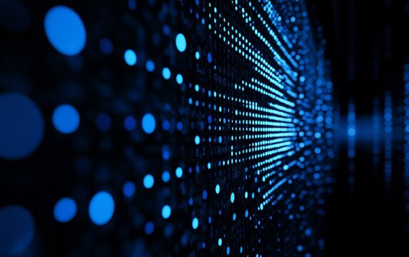 Neon data tunnel converging particle stream with glowing pixels and digital light burst