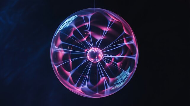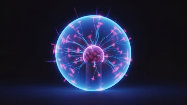 Glowing blue and pink plasma ball with electric sparks on dark background neon light effect abstract science concept